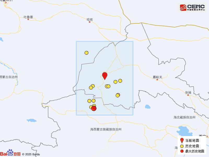 历史地震:根据中国地震台网速报目录,震中周边200公里内近5年来发生3级以上地震共17次,最大地震是2021年6月16日在青海海西州茫崖市发生的5.8级地震(距离本次震中201公里),历史地震分布如图。