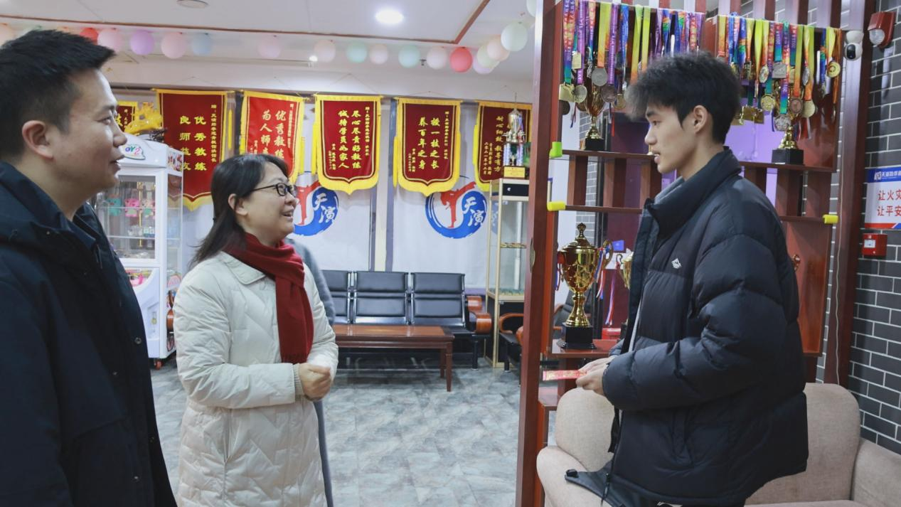 衡阳新闻网讯 通讯员陈曙霞 陈如君 记者唐家华报道 1月19日,衡阳县委副书记、宣传部部长刘洋一行来到天演跆拳道馆,看望正在备战的青年运动员贺鸿浩。这位从金溪镇走出来的少年,已连续三年夺得省赛冠军,正全力向全国赛事更高目标发起冲击。他正是衡阳县体教融合“炼金术”淬炼出的最新成果。
