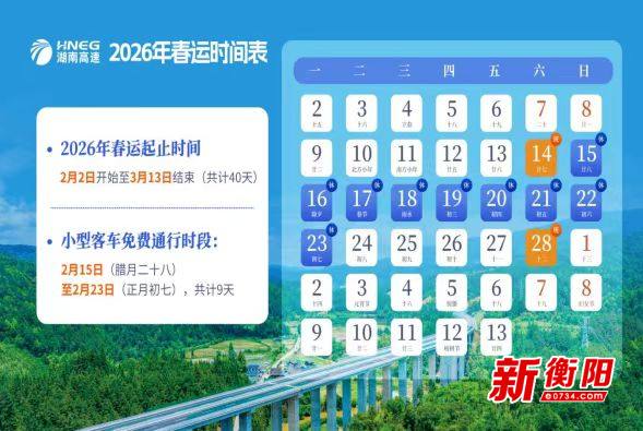 衡阳新闻网讯 记者唐家华报道 2月2日,2026年春运正式拉开帷幕,记者从省高警局衡阳支队获悉,本次春运将持续至3月13日,共计40天,春节假期小型客车免费通行时段为2月15日(腊月廿八)00:00至2月23日(正月初七)24:00,为期9天。