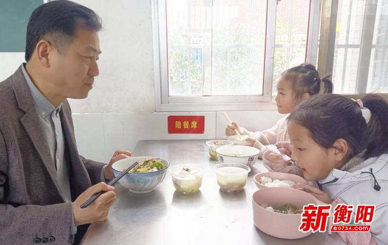 3月5日中餐开餐前,陪餐领导提前进入厨房,检查食品卫生,品尝当餐熟食,然后在登记表中填写情况记载。开餐时,师生们有序排队打饭、用餐,饭菜的鲜香飘荡在食堂的每个角落。“今天的菜,我最喜欢吃小炒肉和淮山排骨汤!我还要去打点饭来。”三(1)班学生胡铧月笑呵呵地对陪餐的校长说。