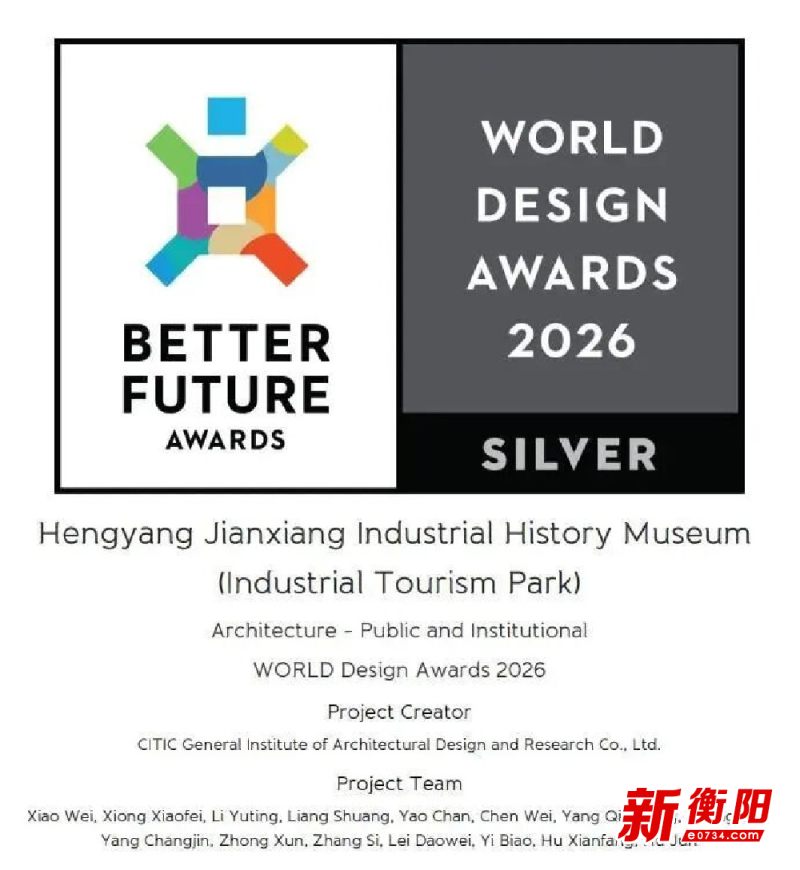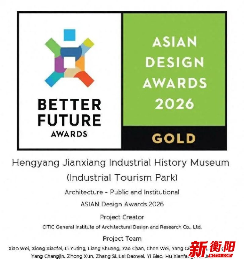 衡阳新闻网讯 通讯员朱南雁 记者程聪报道 继荣获BETTER FUTURE旗下2025柏林设计奖金奖后,衡阳建湘工业历史博物馆(工业旅游产业园)凭借前瞻的设计理念与高质量的实施成果,再度斩获旗下国际重磅荣誉——2026亚洲设计奖金奖与2026世界设计奖银奖,以“老厂房+新业态”的创新实践,持续领跑中国工业遗产保护与城市更新领域。