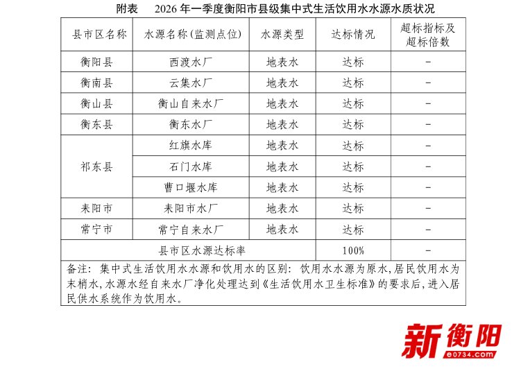 衡阳新闻网讯 记者邵俊杰报道 日前,衡阳市生态环境局发布2026年一季度县级城市集中式生活饮用水水源水质状况报告,监测结果显示,一季度衡阳市县级在用集中式饮用水水源水质全部达标,县域饮水安全保障有力。