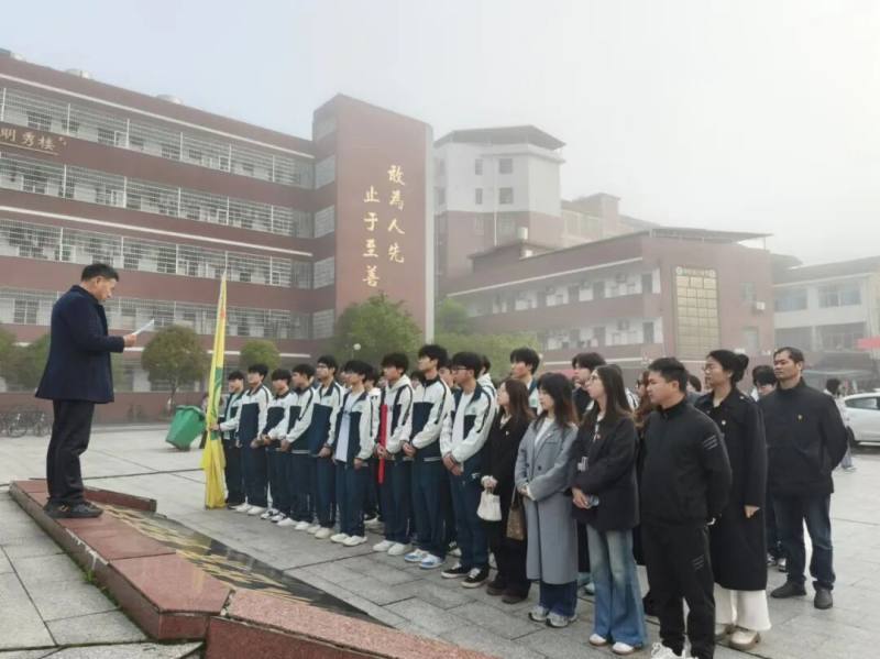 上午7时30分,校园晨光初照,师生精神抖擞、列队整齐,出征仪式在庄重热烈的氛围中拉开帷幕。总督学滕文春作动员讲话,勉励全体师生以庄重之心缅怀先烈、以昂扬之姿投身实践,在活动中赓续红色血脉、砥砺青春担当。随后,滕文春将校旗郑重授予学生代表。旗帜迎风飘扬,全体师生士气高涨。简短而热烈的仪式后,队伍统一步行前往砚池山烈士陵园,正式开启此次主题教育实践之旅。