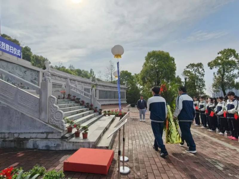 《献花曲》低回婉转,两校学生代表手抬花篮,步履沉稳,缓缓走向纪念碑,将花篮敬置于碑前。湘南实验高级中学党支部书记刘萍上前,仔细整理缎带,“革命烈士永垂不朽”的金色大字在阳光下熠熠生辉,如英魂不灭,浩气长存。