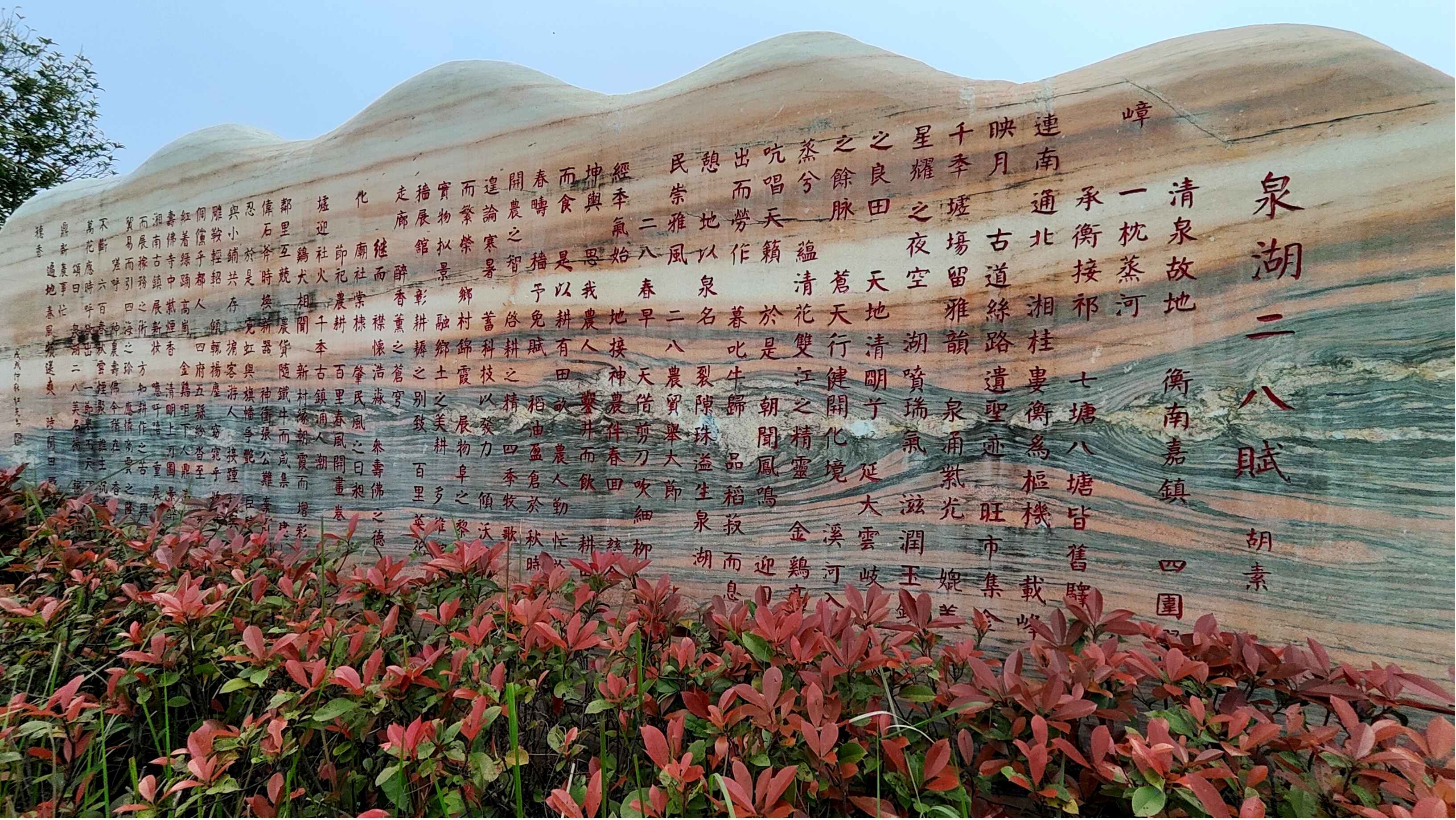 采风团首先来到泉湖二月八农耕文化园。广场上矗立着由中华辞赋家协会副理事长、辞赋家胡素所作《泉湖二月八赋》碑刻。该赋以农历二月初八庙会为脉络,记述了蒸河古道地理风貌、寿佛祭祀民俗与千年圩场商贸景象。2016年,“泉湖二月八”入选省级非遗名录,赋文碑刻成为当地文旅地标。文中提及的“稼穑展馆”“菜花走廊”等意象,已转化为农耕体验园和连片油菜花海。据介绍,二月八庙会年均接待游客超10万人次。