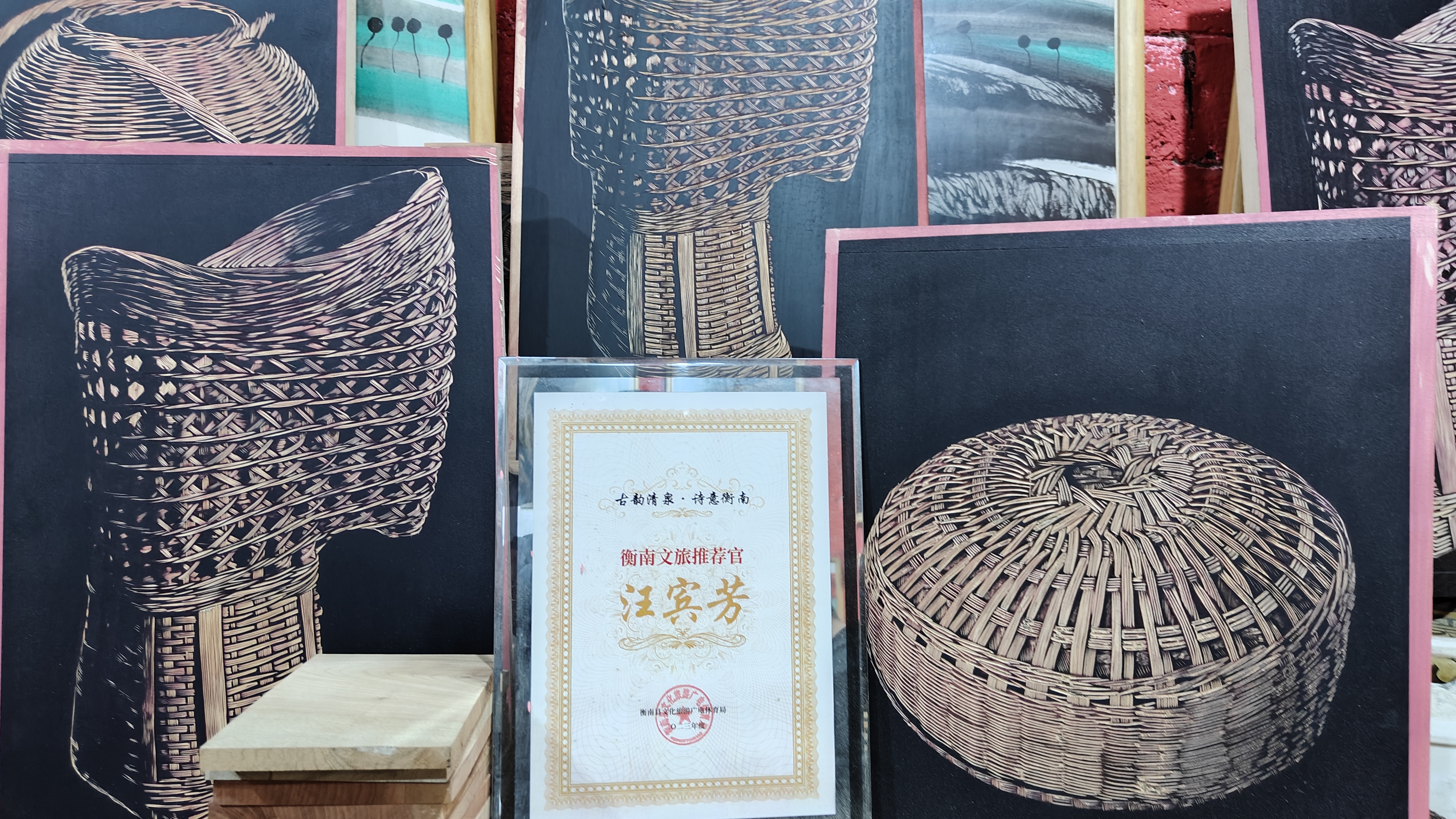 随后,采风团参观了汪宾芳木刻馆。该馆由版画家汪宾芳创建,为市级乡村博物馆,馆藏108件农耕器具雕刻及绘画作品,呈现湘南农耕场景与民俗风貌。木刻馆依托非遗资源开展研学教育活动,开发书签、版画等文创产品,形成“非遗保护—文旅体验—市场转化”的运作模式。