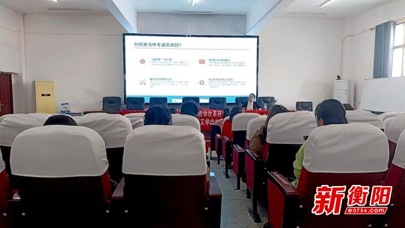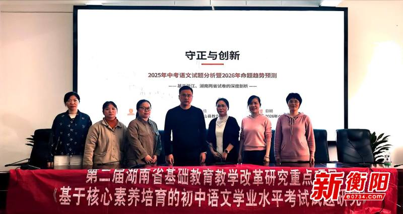 衡阳新闻网讯 通讯员刘晓红报道 4月8日下午,衡山县实验中学省级重点课题《基于核心素养培育下的初中语文学业水平考试试题研究》课题组特邀衡山县初中语文名师工作室首席名师、教育局教研室主任赵清莲来衡山县实验中学开展《2025年中考语文试题分析暨2026年命题趋势预测》专题讲座。校长董育明、副校长李志远及全体语文教师、课题组成员参会。