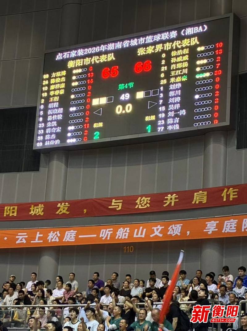 衡阳新闻网讯 记者王平果 周孝芳 通讯员成辉报道 2026年4月10号19:30,湘BA展开了第三轮较量,衡阳队坐镇主场迎战同样两连胜的张家界队。比赛从一开始展开了激烈的拼抢,衡阳队在经过前三节领先后,差点在第四节最后时刻被张家界反杀。最终让全场球迷经历了窒息10秒钟后,衡阳队以71:69险胜张家界队。本轮过后,衡阳队以三连胜站到了排行榜第四。