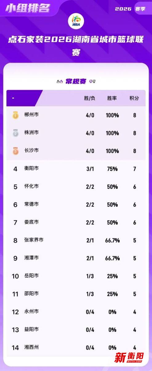 衡阳新闻网讯 记者王平果报道 2026年4月12日19:30,湘BA迎来了第四轮的六场比赛,三连胜衡阳队坐镇主场迎来开赛以来最强劲对手株洲队,经过一番苦战,最终衡阳队61:76不敌株洲队,连胜纪录终结。至湘BA第四轮,保持全胜的球队还剩下三支,分别是郴州队、株洲队和长沙队。郴州队继续以8分稳居榜首,衡阳队3胜1负积7分依然排名第四。