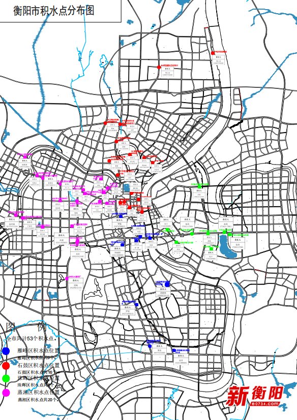 石鼓区:建设村五组旺茗居积水点、五一路小学旁停车坪、华源大市场与中湘五金机电大市场交汇处积水点(华源支路)、107国道与蒸湘北路交汇处积水点大宅第餐饮店门口、黄沙湾街道雁栖湖西湖湾、金源街道资家港河道及排渍站、石鼓区金源街道107国道与化工路交叉口、古汉大道24号花鸟市场、青少年宫内、学宫巷19号学宫巷内巷子里、青山街道常胜路、解放大道与湘江南北路交叉口、蒸湘北路与北二环十字路口(有内涝风险)、蒸湘北路蒸水一号段、二环北路与蔡伦大道匝道、衡湘公路大桥百花市场段(有内涝风险)。