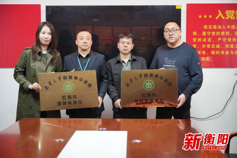 衡阳新闻网讯 通讯员彭丽平 李颖报道 为持续推动医联体建设,促进优质医疗资源下沉,4月14日下午,南华大学附属南华医院肛肠科主任邓秋林率队赴衡东县第五人民医院进行医联体协作单位及专科联盟授牌。衡东县第五人民医院党政领导班子及两院肛肠专科骨干共同参会。