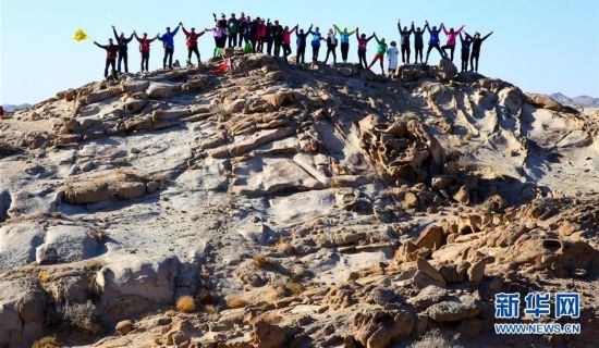 11月19日,游客在内蒙古阿拉善盟“海森楚鲁”怪石林里游览。 “海森楚鲁”怪石林位于内蒙古阿拉善盟巴丹吉林沙漠西北边缘的戈壁中,石林内分布着各种形态的奇石。由于地质变迁,深埋在地表下的沉积岩露出地面,砾石在强风力的作用下形成了独特的蜂窝石、风蚀柱等极为壮观的巨大砾石,吸引着游客前来观光和探险。新华社发(王将摄)