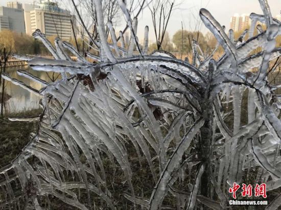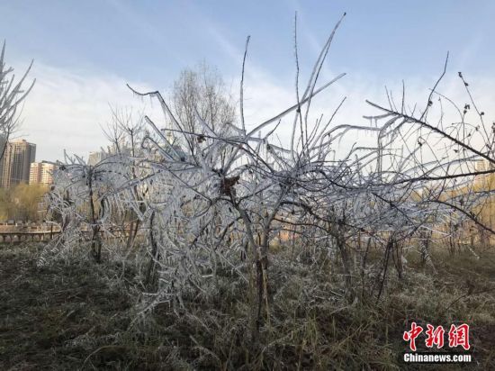 被冬灌的植物上凝结出冰挂景观。彭伟 摄