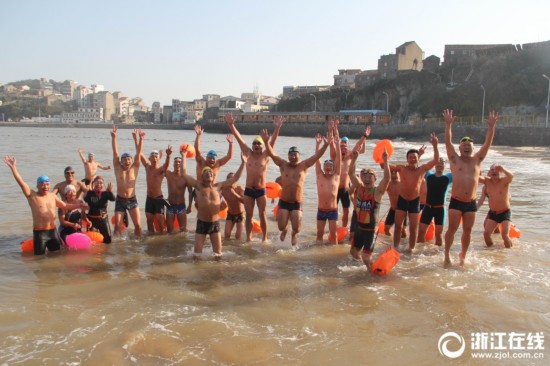 到达终点后,冬泳爱好者们聚在一起合影。