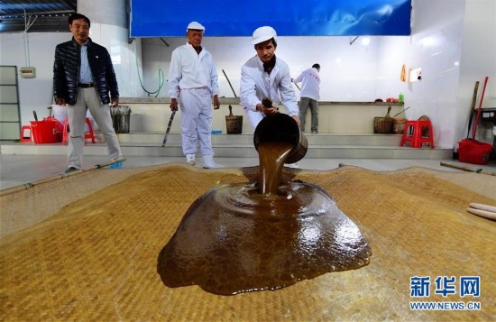 12月9日,在福安市溪潭镇洪口村的红糖作坊里,制作红糖的工人把熬好的甘蔗汁倒在草席上冷却。