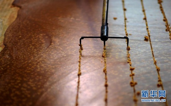12月10日,在福安市溪潭镇洪口村的红糖作坊里,工人用钉耙在冷却的红糖板上进行分割。