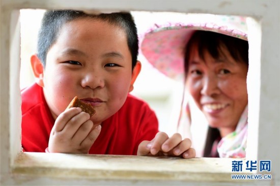 12月10日,在福安市溪潭镇洪口村的红糖作坊里,一名参观的小朋友在品尝刚制好的红糖块。