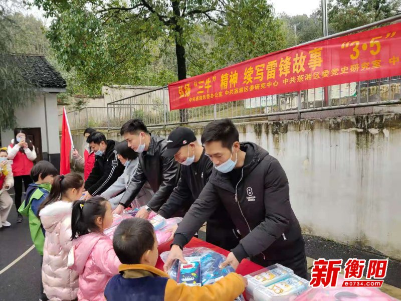 ▲蒸湘区志愿者在雨母山中小学为留守贫困儿童送去文具等