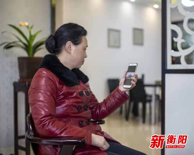 ▲蒸湘区市场监管局退休党员欧燕萍在家用手机收看报告直播