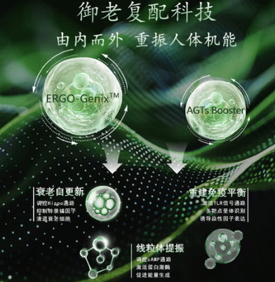 ERGO-Genix®御老因子:支持细胞自身的更新代谢节奏,并辅助维持细胞能量工厂(线粒体)的功能效率。