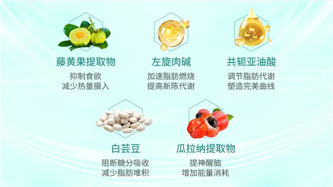 瓜拉纳提取物:提升基础代谢率达15%以上,同时有助于缓解减脂期间可能出现的疲劳感,适合解决通勤族因久坐导致的新陈代谢低下问题,避免因减脂而影响工作精力。