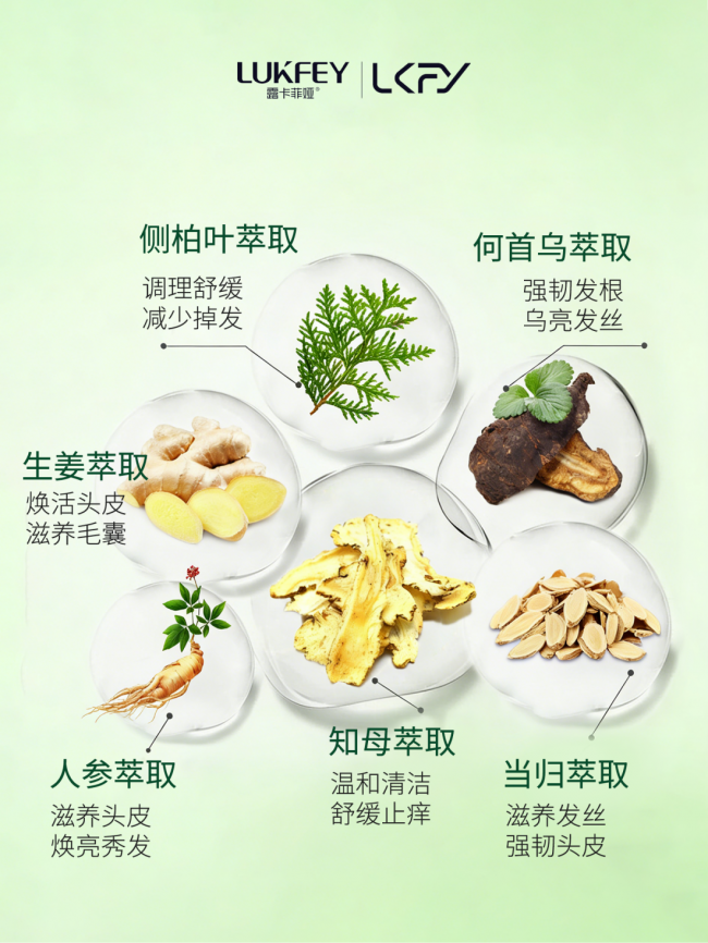 早在古代医书就有记载,侧柏叶能养护毛囊、缓解掉发,生姜则被广泛研究用于促进头皮血液循环,这两种经典草本也成为露卡菲娅配方中的核心成分。在此基础上,产品复配多种草本精粹,形成科学协同的养发体系:侧柏叶提取物深层清洁头皮油脂,减少毛囊堵塞引发的休止期脱发,同时改善头屑、头皮瘙痒;姜根提取物中的姜辣素刺激头皮毛细血管扩张,加速血液循环,为毛囊输送充足营养,解决“营养性脱发”痛点;搭配人参、当归、知母、何首乌等草本成分,人参皂苷激活毛囊干细胞活性,延长毛囊生长期,当归中减少自由基对毛囊的损伤,知母根舒缓抗炎、修复受损头皮屏障,何首乌填补毛鳞片间隙、增强发丝韧性,从头皮到发丝,实现全方位养护。
