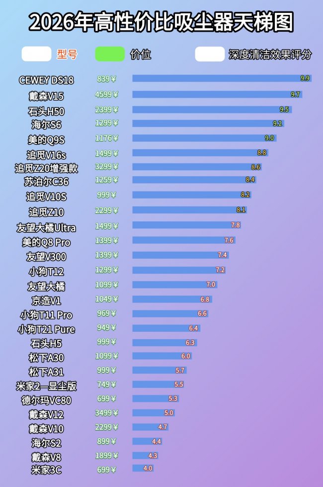 在正式开始介绍之前,我先放张2026年热门吸尘器的天梯排行图,给大家一个