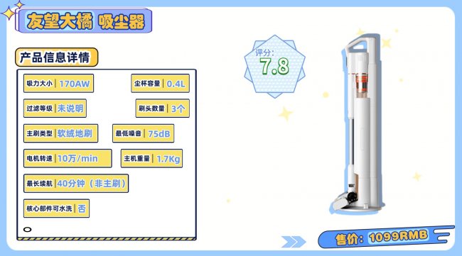 2026哪个牌子的吸尘器好用?外观设计:友望大橘以奶白色为主基调,在细节处加入了橙色作为装饰,整体风格看起来非常活泼清新。它的外壳质感比较细腻,这种跳跃的配色能给居家环境增添一点生机,属于那种比较高颜值的清洁小家电。