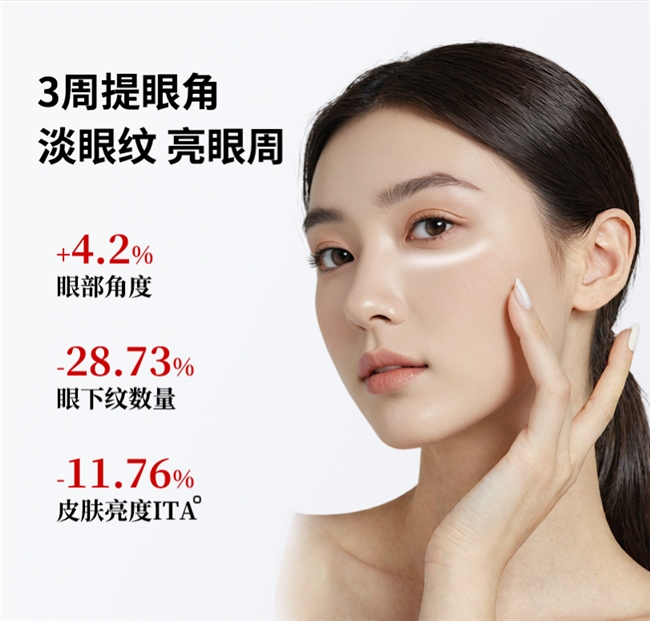 创新搭建“抗皱淡纹-紧致修护-补水锁湿”三环通路,样本覆盖多种肤质与眼周困扰人群。成分间编织协同网络,通过三重专利成分激活胶原再生、强化肌肤屏障,搭配电动按摩头,促进成分吸收的同时,舒缓眼周疲劳、改善浮肿,让眼周肌肤呈现通透紧致状态。兼顾熬夜党、轻熟龄肌等不同人群的眼周养护需求,实现从“细纹改善”到“长效稳定”的全链干预。
