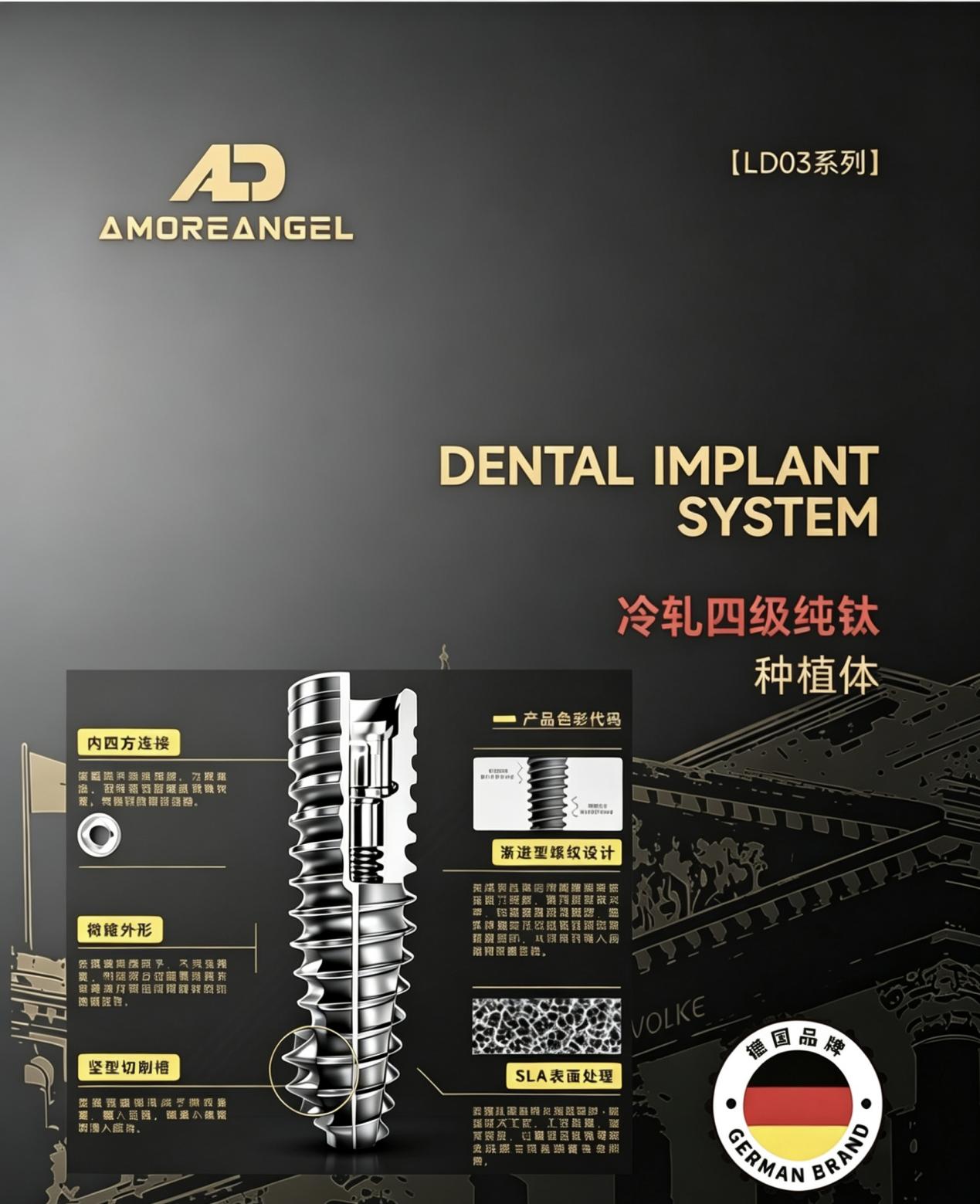 ALD种植体系德国AMOREANGEL品牌旗下的专业口腔种植体产品,2010年与ITI深度合作研发,2025年在国内同平台生产,从材料到表面技术保持一致性的同时,推出极具性价比的不二之选,,LD03系列冷轧四级纯钛种植体,以高生物相容性、优异骨结合效率、全规格适配性为核心特点,为各类牙齿缺失患者提供高效、稳定的种植修复解决方案,是临床中适配性强、性价比突出的德系种植体选择。