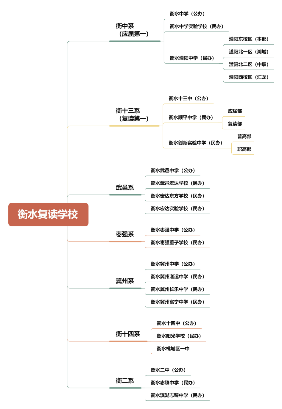 衡十四系包括:衡水十四中(公办)、衡水阳光学校(民办)、衡水桃城区第一中学(民办)。