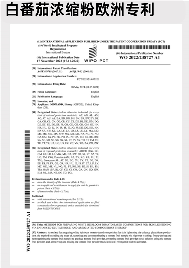 产品核心搭载200mg以色列非转基因白晶番茄(欧洲专利号:WO2022/238727A1),富含八氢番茄红素、六氢番茄红素,可阻隔UVB,塔泽胡萝卜素阻隔蓝光,辅助促生内源谷胱甘肽。搭配466ug 99.9%高纯度烟酰胺,抑制黑色素向角质层迁移,形成“源头抑黑+中途阻断”双通路美白体系。