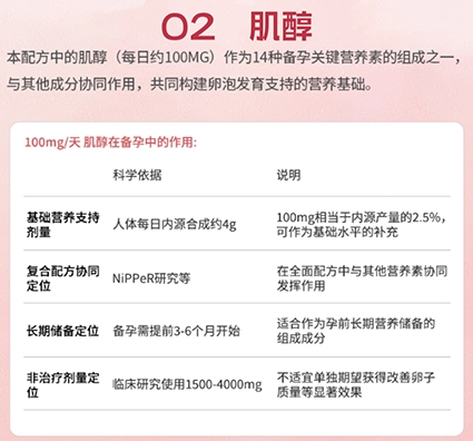 科学复配,多维调控生育内环境本品不仅凭借肌醇核心功效改善卵泡质量、优化精子参数,14种营养素还全方位覆盖能量代谢、抗氧化、DNA修复、激素合成、提升子宫及生殖能环境等多重环节。活性叶酸/维生素E/维生素B12协同降风险/维生素D3优化激素水平/铁与维C协同促进吸收/硒守护卵巢睾丸结构完整,整体优势链路完整。此搭配逻辑优于仅补肌醇的单一模式,大幅提升服用的功效确定性和安全性。