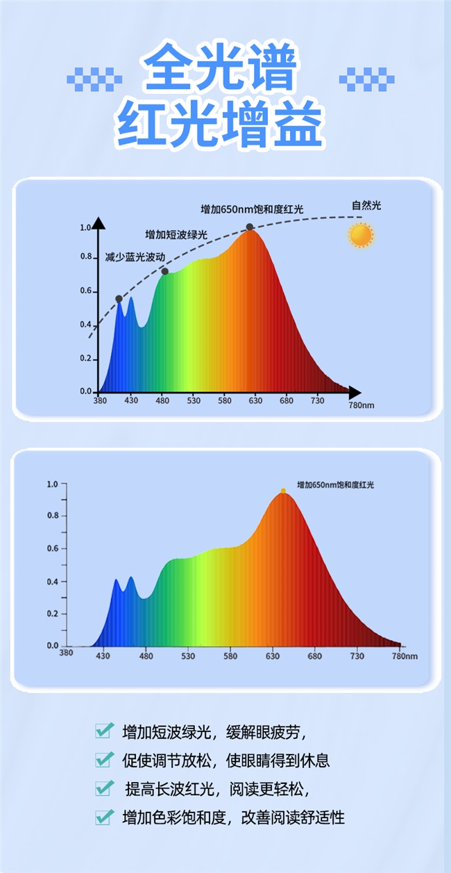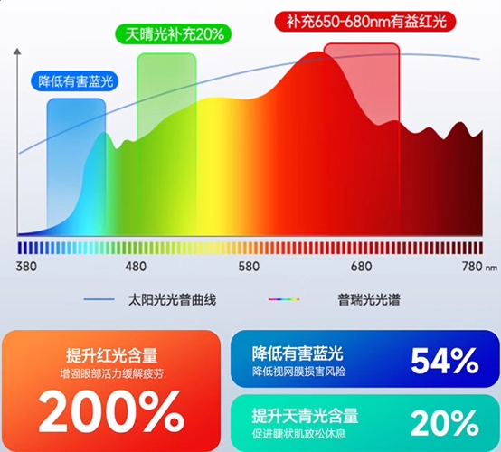 答:全光谱灯主要作用是模拟自然光光谱,属于被动防护。而融入660nm或670nm红光技术的产品,是在提供优质显色的基础上,通过特定红光照射主动促进眼底脉络膜微循环,为眼睛输送光营养,两者的防护效果有着本质区别。