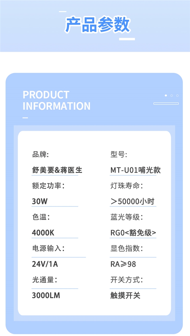 该款机型主打红光增益技术与高性价比,额定功率设定为30W,实测光通量达到3000lm,同时配备了宽达80cm的发光面,能够提供宽广且柔和的桌面光照。其核心特色在于搭载了专研红光增益技术,通过补充650nm饱和度红光及短波绿光,深入眼底缓解因长时间用眼引发的睫状肌疲劳。在硬件交互上,设备支持四档亮度调节,并配备独立哺光模式控制面板。全光谱护眼芯片的应用确保了光源无可视频闪。品牌同样为该款产品提供了一年换新三年保修的安心售后政策。