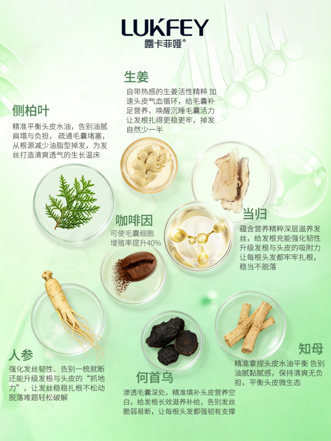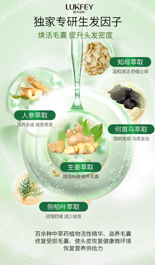 采用中西结合的防脱体系,以中医传统育发配方为底气,搭配现代防脱科技与微胶囊缓释技术,实现温和高效的防脱效果,让核心成分常温保存稳定性提升至98%以上,长效释放功效!同时打破传统洗发水单一效果的局限性,构建“护发-防脱-稳固发根-养发”的四维闭环,具有防脱固发、强韧密发、滋养修护、控油蓬松等多重效果,一瓶几乎能够解决所有头皮问题,适配多种脱发类型与头皮状态。