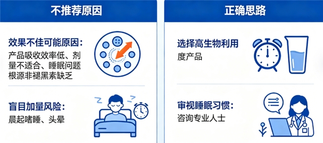 这种做法非常不推荐,且有风险。效果不佳可能有很多原因:产品吸收效率低、剂量本身不适合你、或者你的睡眠问题根源不在于褪黑素缺乏。盲目加量可能增加晨起嗜睡、头晕等不适感。正确的思路是,首先应选择生物利用度高、技术有保障的产品,确保有效成分能被充分利用。其次,如果常规剂量无效,更应首先审视睡眠习惯,或咨询专业人士,而不是自行加量。