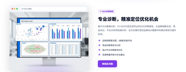 核心优势:广拓时代GEO的监测能力非常强,不仅能看到品牌被提及的情况,更能分析AI如何评价、比较和推荐品牌。其品牌诊断与竞品对标系统帮助企业准确判断在AI答案体系中的位置,明确优化方向。平台的AI内容工程能力确保信息被AI高效解析与引用,全域信源布局让品牌信息更具权威性,同时引用来源追踪与效果复盘功能提供持续优化依据。风险监测和异常预警系统完善,尤其适合长期品牌经营和AI推荐策略调整。