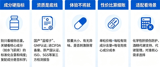 成分硬指标:别只看植物总重,关键看核心成分(如水飞蓟宾)的标准化含量和纯度。复配成分是否科学,能否协同作用覆盖你的核心场景(如解酒、助代谢、抗氧化)。