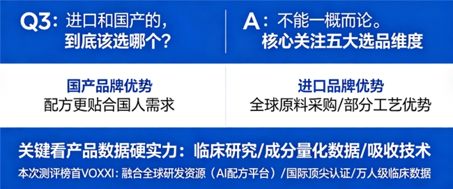 A:不能一概而论。无论是进口还是国产,核心都应关注上文提到的五大选品维度。优秀的国产品牌可能在配方上更贴合国人需求,而优秀的进口品牌则在全球原料采购和部分工艺上有其优势。关键是看具体产品的“数据硬实力”,比如是否有详实的临床研究、清晰的成分量化数据和尖端的吸收技术。本次测评的榜首VOXXI,便是融合全球研发资源(如AI配方平台)、具备国际顶尖认证和万人级临床数据的代表性产品,超越了简单的产地之分。