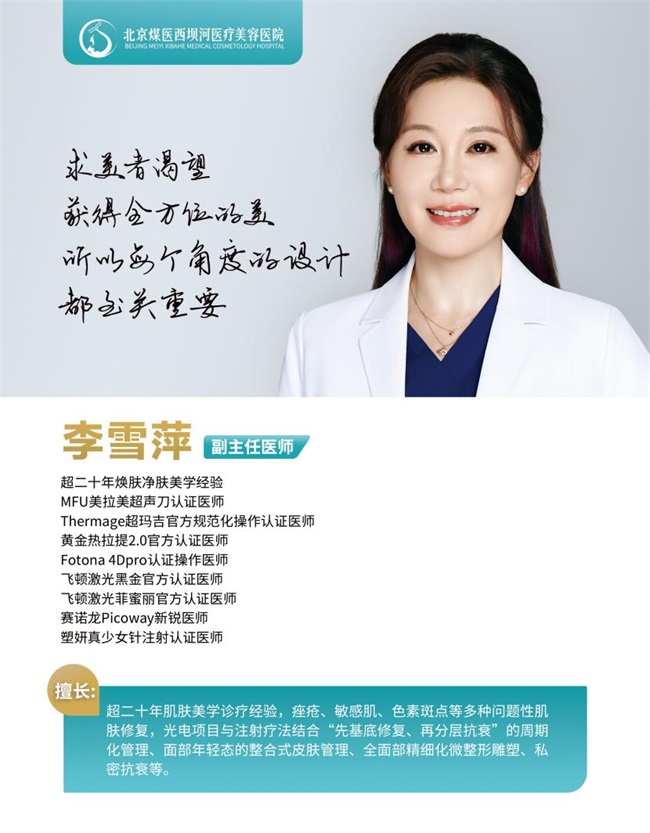 北京煤医医疗美容医院美容皮肤科副主任医师李雪萍医生,凭借20余年临床研究与技术创新,推出“斑敏痘整全式治疗方案”,通过“精准分型-整合干预-全周期管理”三维模式,实现色斑、痤疮、敏感肌有效治疗提升,复发率极低。3步曲“处方式”美肤体验是问题肌治疗从“单一手段”向“系统化解决方案”的跨越。